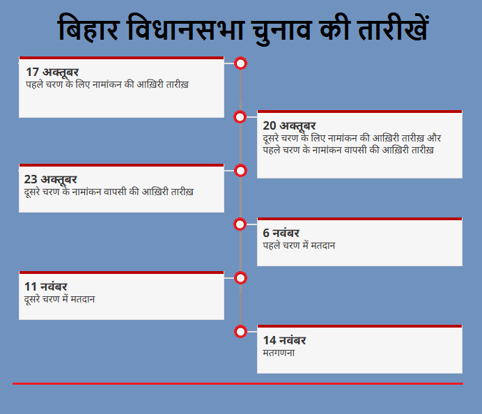 भारत निर्वाचन आयोग ने बिहार विधानसभा चुनाव के लिए निम्नलिखित तिथियाँ घोषित की हैं: